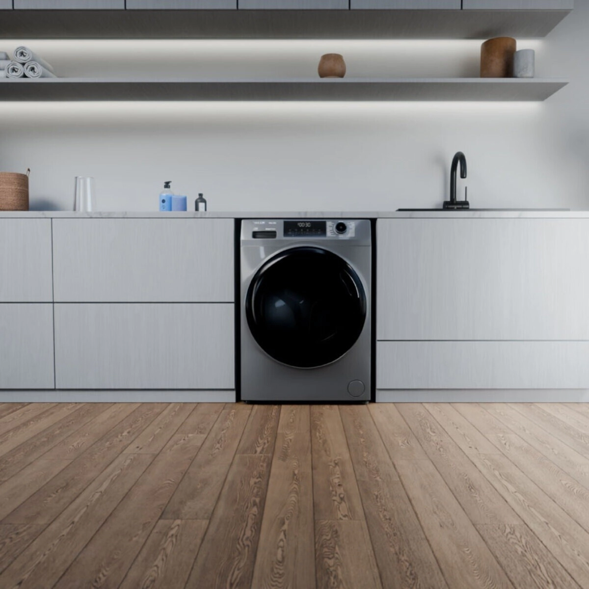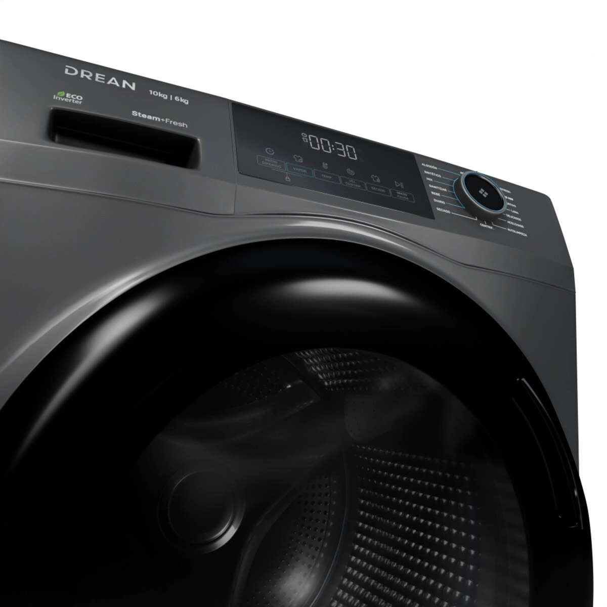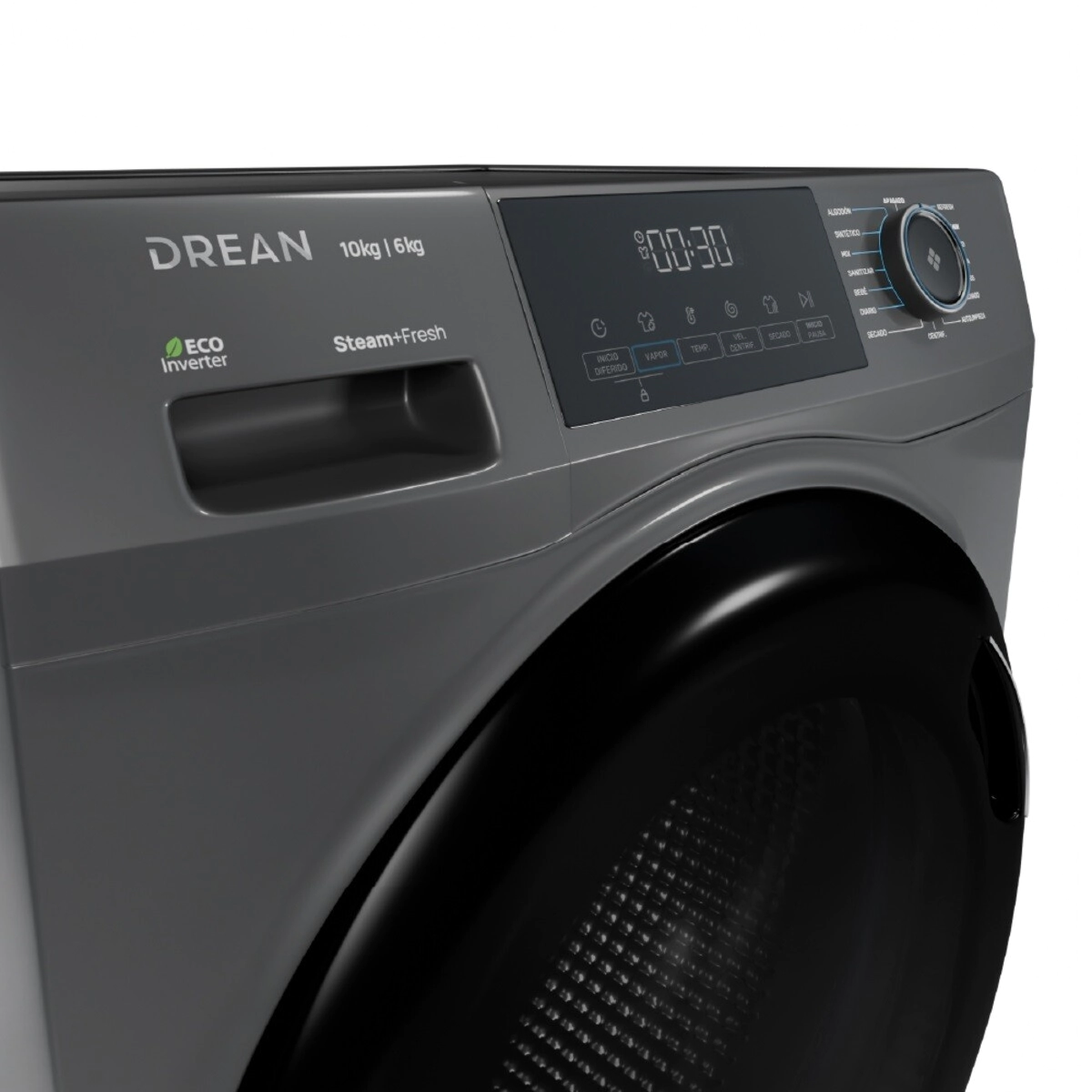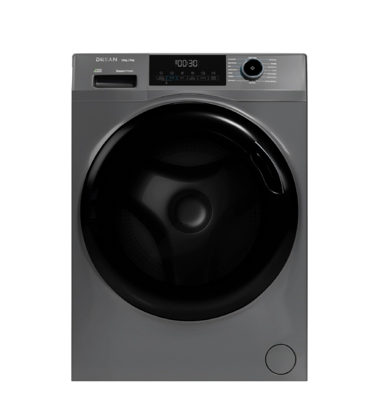 Con un diseño elegante en color gris, display LED intuitivo y controles digitales con perilla bidireccional, este lavasecarropas ofrece tecnología, practicidad y diseño inteligente en un solo equipo.