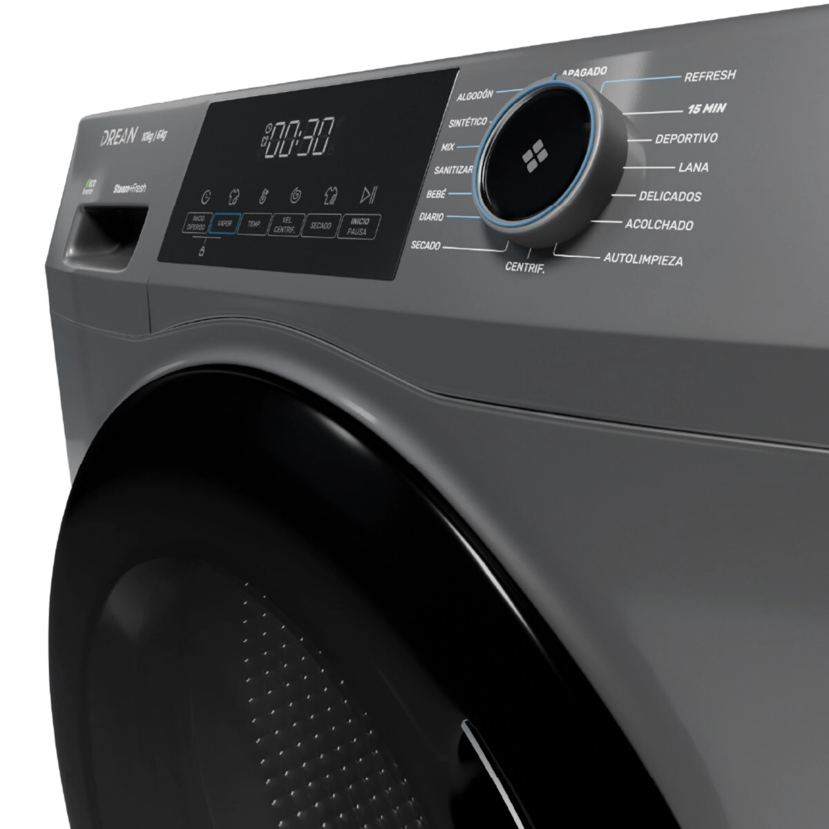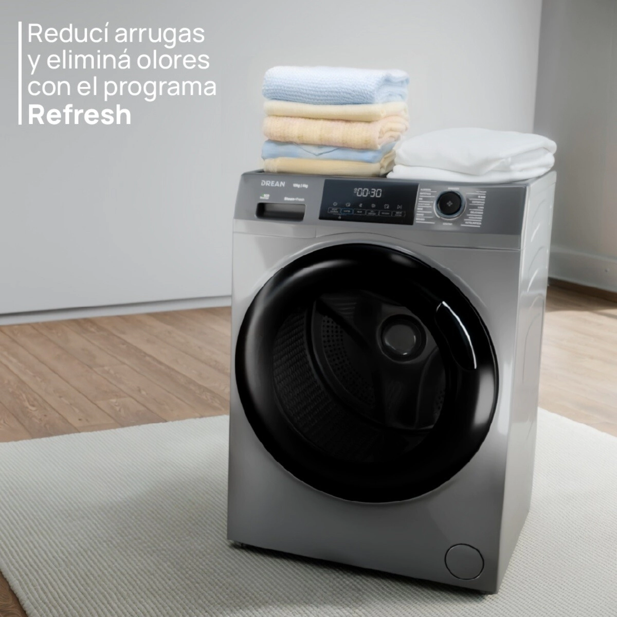 • Programas incluidos: Algodón, Sintético, Diario, Refresh, Rápido 15 min, Sanitizar, Bebé, Secado, Centrifugar, Mix, Deportivo, Lana, Delicados, Acolchado, Autolimpieza