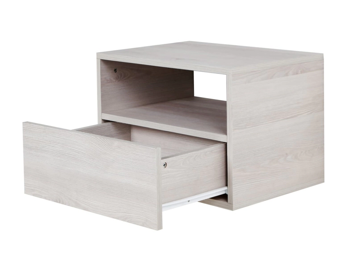 La Mesa de Luz Flotante es práctica y versátil, con un diseño adaptable que permite colocar el cajón tanto en la parte superior como en la parte inferior. Ideal para optimizar espacios y dar un toque moderno a tu habitación.