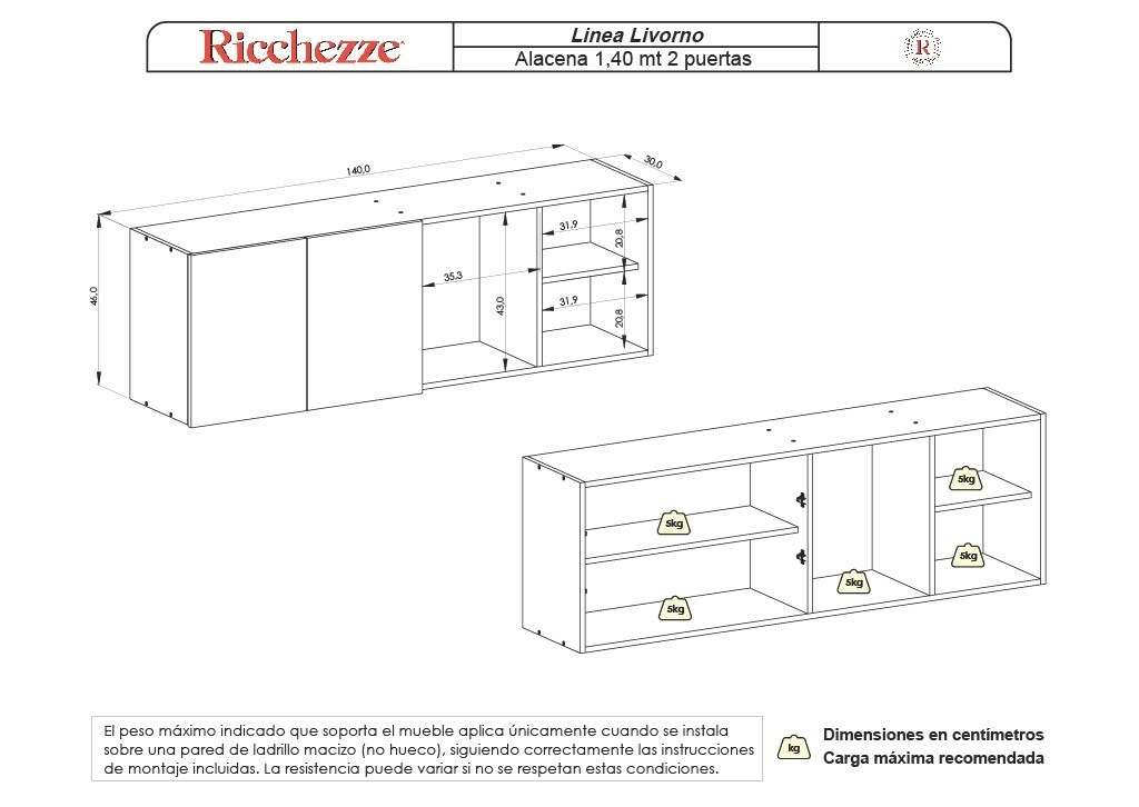 • Dimensiones: Ancho 140 cm - Alto 46 cm - Profundidad 31,8 cm