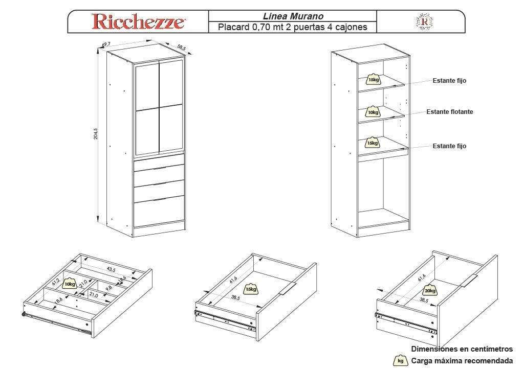 • Placard 2 Puertas 4 Cajones con Espejo.